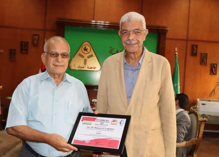 كرم رئيس جامعة المنوفية الدكتور محمود عويضة لنيله درع وجائزة التميز في مجال الإعجاز العلمي في القرآن الكريم من جامعة “باشن” الأمريكية