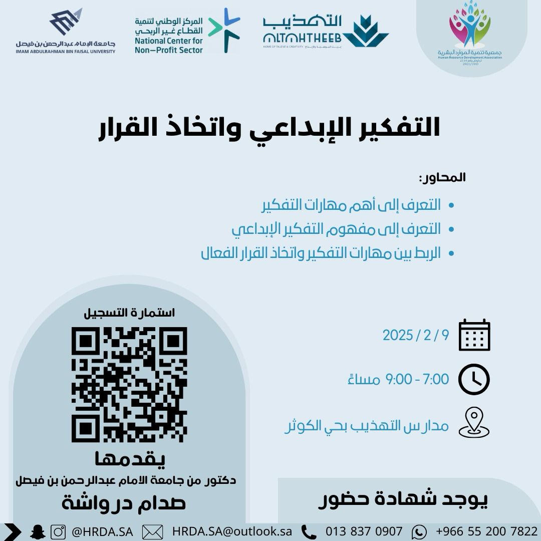 في إطار الشراكة المجتمعية بين جمعية تنمية الموارد البشرية بسيهات وشركة مدارس التهذيب نظمت الجمعية مساء أمس الأحد التاسع من فبراير ٢٠٢٥م وبالتعاون مع جامعة الإمام عبدالرحمن بن فيصل بالدمام ومباركة المركز الوطني لتنمية القطاع غير الربحي محاضرة ( التفكير الإبداعي واتخاذ القرار ) والتي قدمها الدكتور صدام درواشة الاستاذ المساعد بجامعة الإمام عبدالرحمن بن فيصل بالدمام.