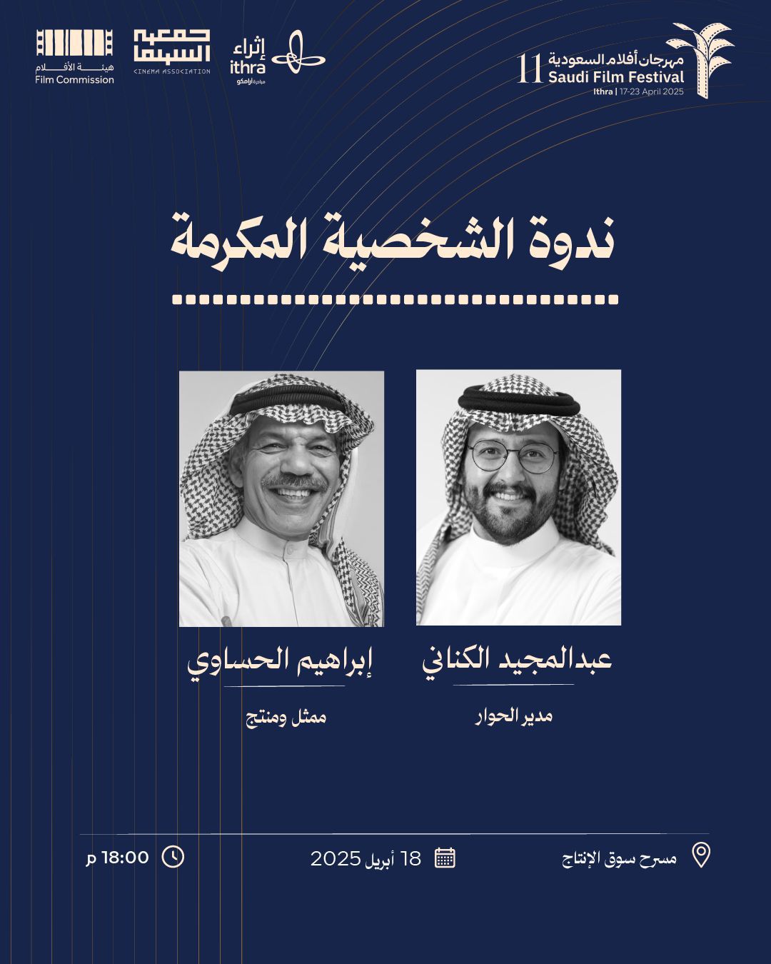 وفي ثاني أيام المهرجان، تُقام ندوة حوارية على مسرح سوق الإنتاج، تُسلّط الضوء على محطات إبراهيم الحساوي الفنية، وتتناول إسهاماته في دعم صناعة الأفلام في المملكة، يديرها الفنان والإعلامي عبدالمجيد الكناني. كما تُقام جلسة توقيع للكتاب في ذات اليوم، تُتيح للحضور التفاعل المباشر مع الفنان ومؤلف الكتاب.
