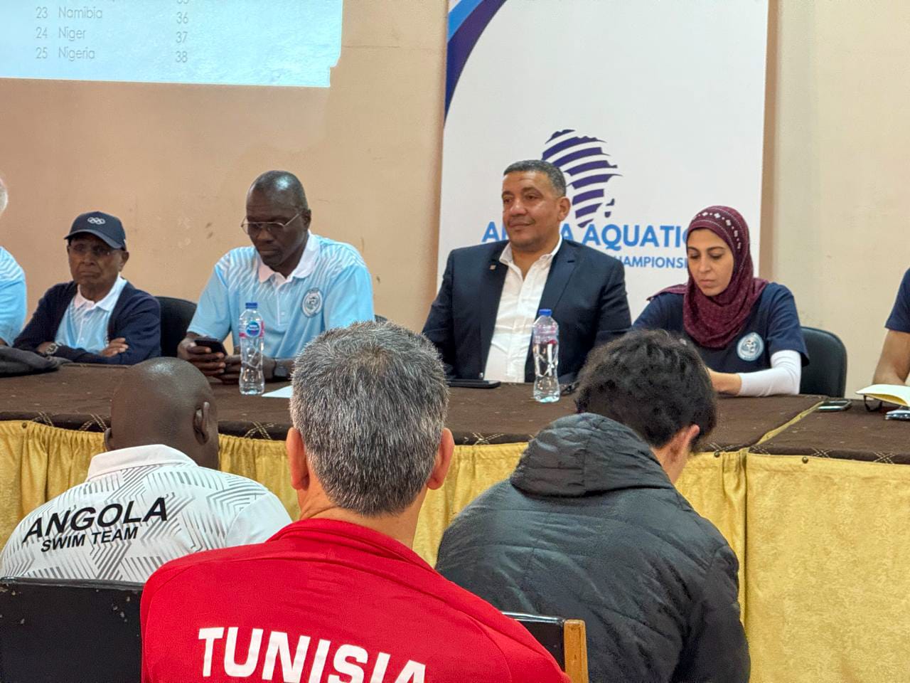 وقد حضر الاجتماع الأستاذ إسلام صميدة، عضو مجلس إدارة الاتحاد المصري للسباحة، والذي ألقى كلمة نيابة عن المهندس ياسر إدريس، رئيس الاتحاد، رحب فيها برئيس وأعضاء الاتحاد الأفريقي، وأعضاء اللجنة الفنية، وجميع الوفود الحاضرة، متمنياً لهم التوفيق والنجاح في فعاليات البطولة.