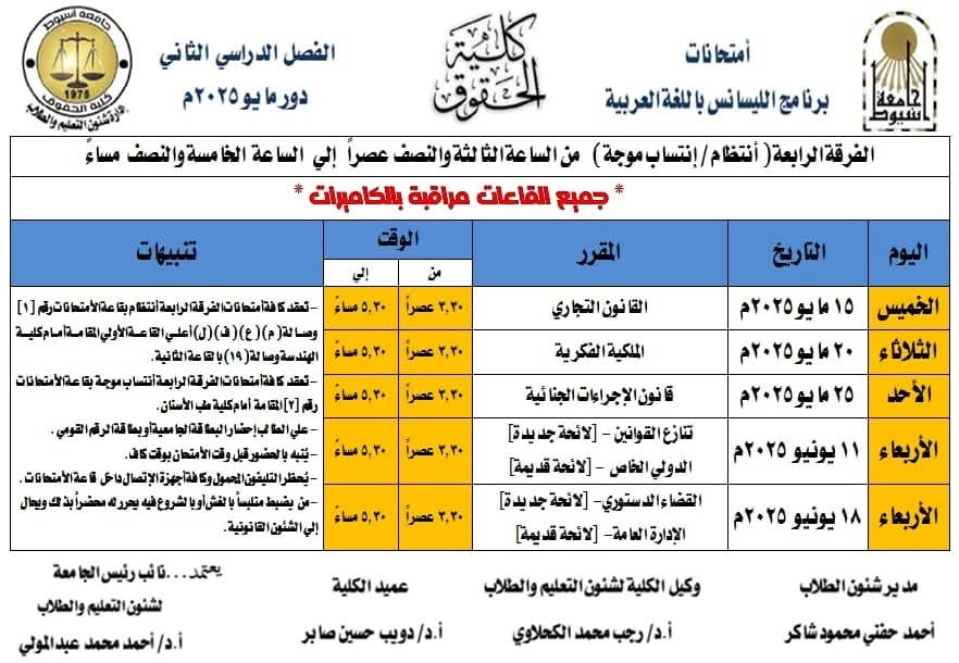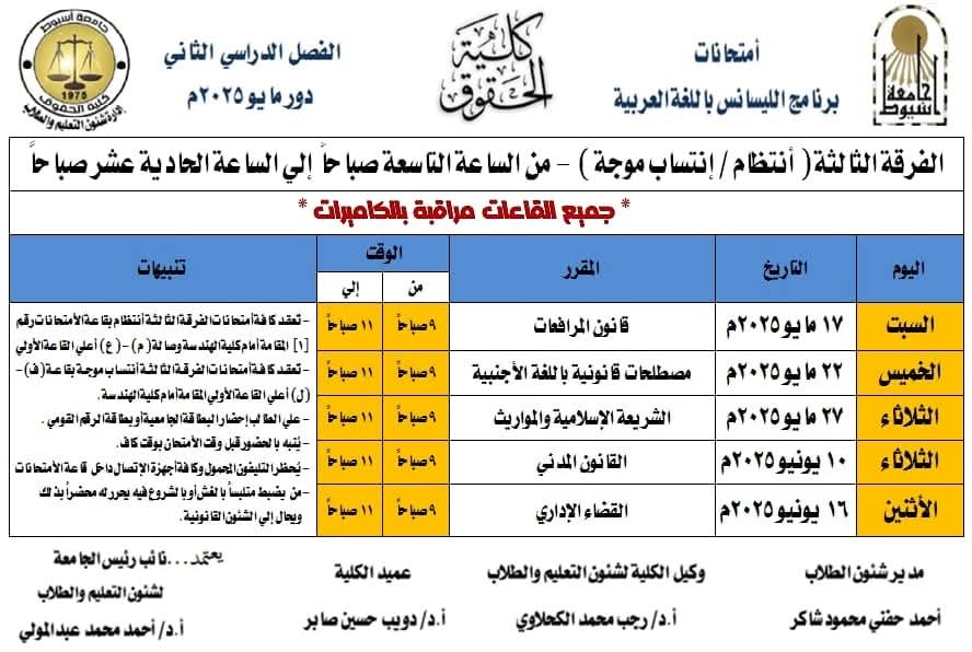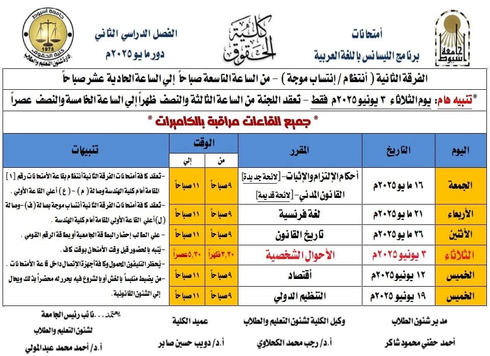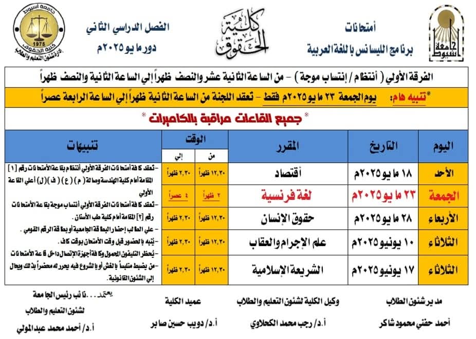 بعد ماتداولته مواقع التواصل الاجتماعى والأوساط الجامعية خلال الاسابيع الماضية حول مقترح عقد امتحانات الثانوية العامة بالجامعات وترتب عليه تقديم موعد امتحانات آخر العام الدراسي الجامعى وذلك لتخلو الجامعة وتستعد لاستقبال طلاب الثانوية العامة فى امتحاناتهم .. وبعد رفض هذا المقترح رسميا تم تعديل جدول امتحان آخر العام الدراسي الجامعى بعد ان كان مقررا لبدايته يوم٥مايو القادم لتبدأ الامتحانات بكلية الحقوق يوم١٥مايو القادم ..وفقا لماصرح به الدكتور دويب حسين صابر عميد كلية الحقوق ..جامعة اسيوط …مصرحا بأنه تم وضع جدول الامتحانات بضوابط تراعى مصلحة الطلاب بما فى ذلك الطلاب الوافدين واضاف بأن هناك فاصل زمنى فى جول الامتحانات وهو اجازة عيد الاضحى المبارك بما يمنح الطلاب الفرصة مراجعة المواد الدراسية المتبقية لهم وذلك وفقا للتوجه العام من كلية الحقوق فى الاستجابة لرغبات الطلاب والعمل على دعمهم والحرص على مصالحهم….تجدر الإشارة إلى أن الدكتور احمد المنشاوى رئيس جامعة أسيوط قد اعلن عن ان موعد نهاية امتحانات الفصل الدراسي الثاني للعام الجامعي 2024 / 2025 هو 21 يونيو 2025