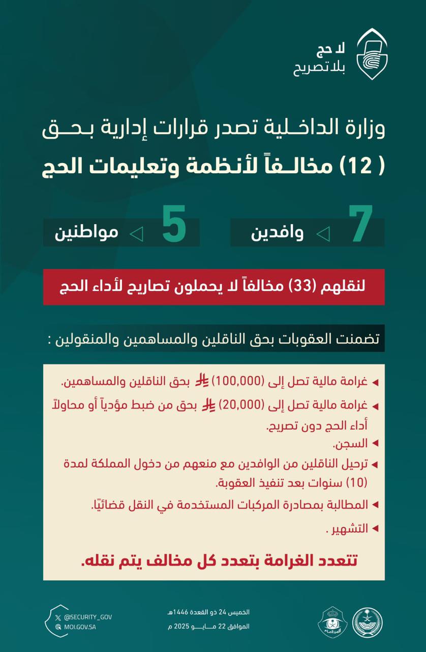 وأصدرت الوزارة بحق الناقلين والمسهمين والمنقولين قرارات إدارية عبر اللجان الإدارية الموسمية، تضمنت عقوبات بالسجن وغرامات مالية تصل إلى (100,000) ريال، والتشهير بالناقلين وترحيل الوافدين منهم مع منعهم من دخول المملكة لمدة (10) سنوات بعد تنفيذ العقوبة، والمطالبة بمصادرة المركبات المستخدمة في النقل قضائيًا، ومعاقبة من حاول أداء الحج دون تصريح بغرامة مالية تصل إلى (20,000) ريال.
