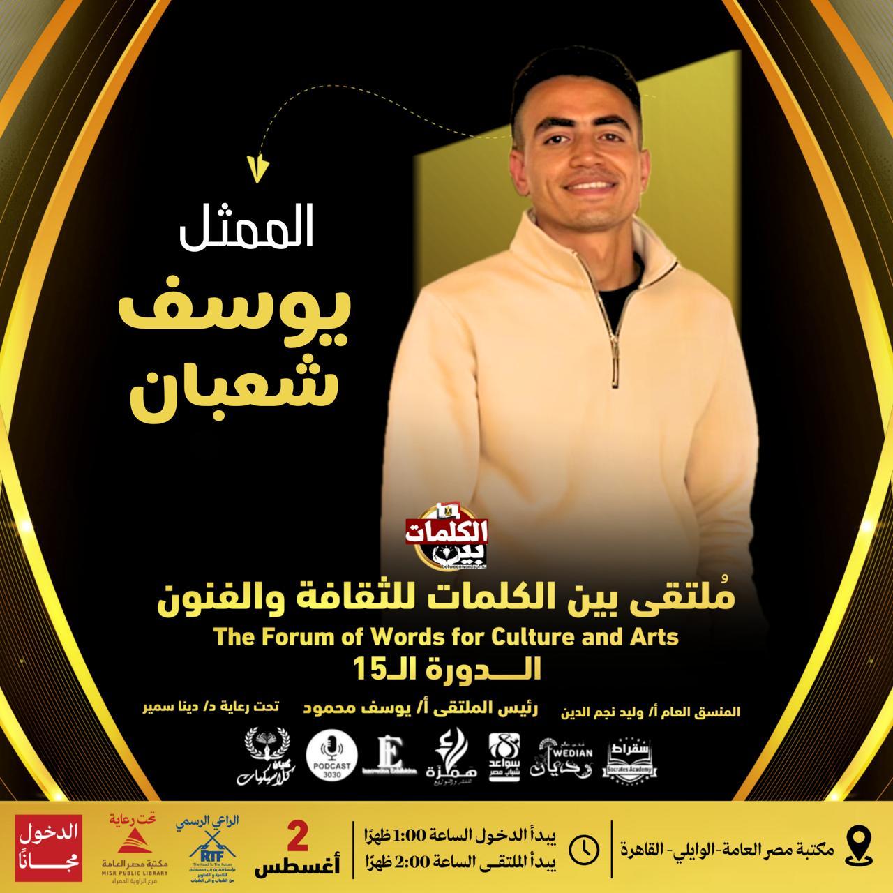 في مفاجأة ينتظرها جمهور الملتقى، يشارك الممثل الشاب يوسف شعبان لأول مرة على خشبة المسرح ضمن فعاليات ملتقى “بين الكلمات” للثقافة والفنون في دورته الـ15، والمقام يوم السبت 2 أغسطس 2025 بـمكتبة مصر العامة – فرع الزاوية.