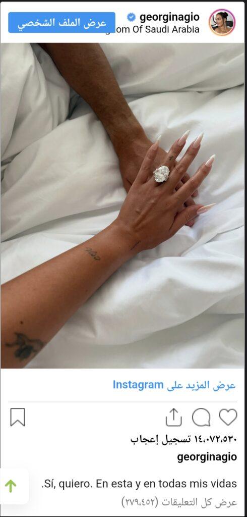 وشاركت جورجينا متابعيها على “إنستغرام” بصورة خاتم ألماس ضخم على إصبعها الأيسر، بجانب يد رونالدو، معلقة: “نعم، أنا موافقة، في هذه الحياة وفي كل حياتي”.