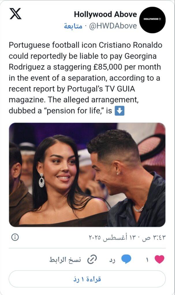 ووفقا لمجلة TV GUIA البرتغالية، اتفق الثنائي على بنود مالية تضمن لجورجينا حياة مريحة في حال الطلاق، تشمل: