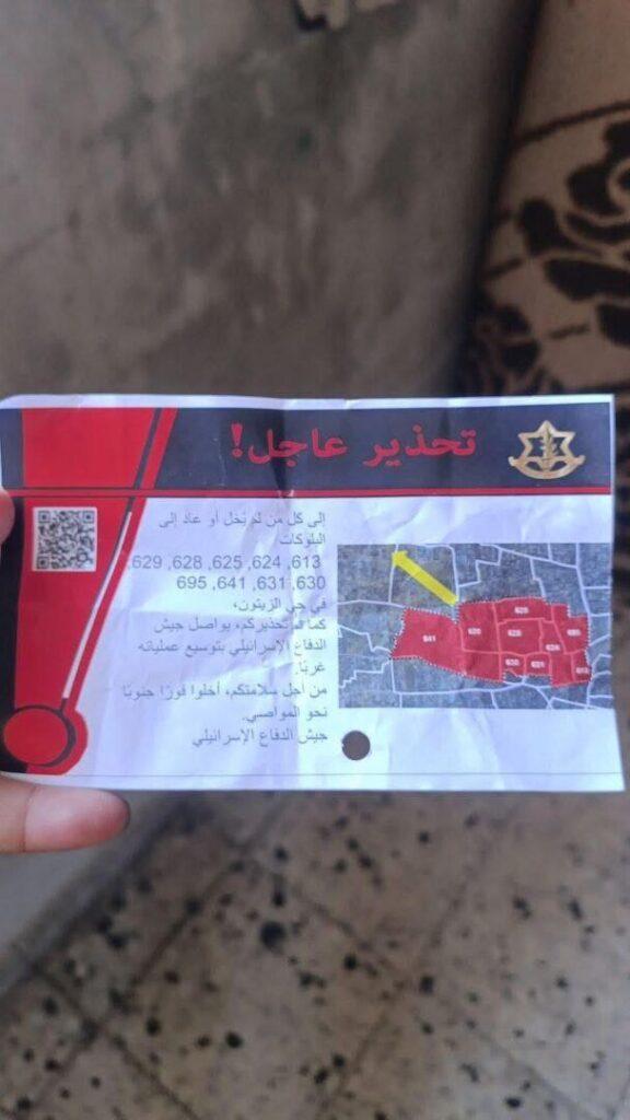 وجاء في المناشير التي ألقيت: “تحذير عاجل! إلى كل من لم يخل أو عاد إلى البلوكات
