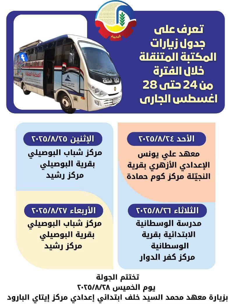 وجهت الدكتورة جاكلين عازر – محافظ البحيرة بضرورة نشر الثقافة وتعزيز الوعي المجتمعي لدى مختلف الفئات العمرية، والحرص على وصول الخدمة المكتبية والمعرفية إلى القرى والنجوع، تواصل المكتبة المتنقلة جولاتها التوعوية والثقافية داخل المحافظة خلال الفترة من ٢٤ حتى ٢٨ أغسطس ٢٠٢٥.
