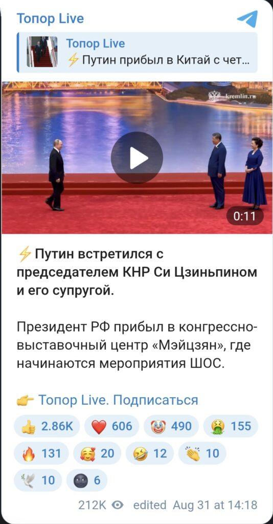 ونشر الكرملين لقطات لاستقبال الرئيس الصيني شي جين بينغ وقرينته بينغ لي يوان الرئيس الروسي فلاديمير بوتين في مقر انعقاد قمة منظمة شنغهاي للتعاون بمدينة تيانجين الصينية، حيث تُقام مأدبة ترحيب بالزعماء المشاركين في القمة ، حسبما أفاد تلفزيون الصين المركزي.