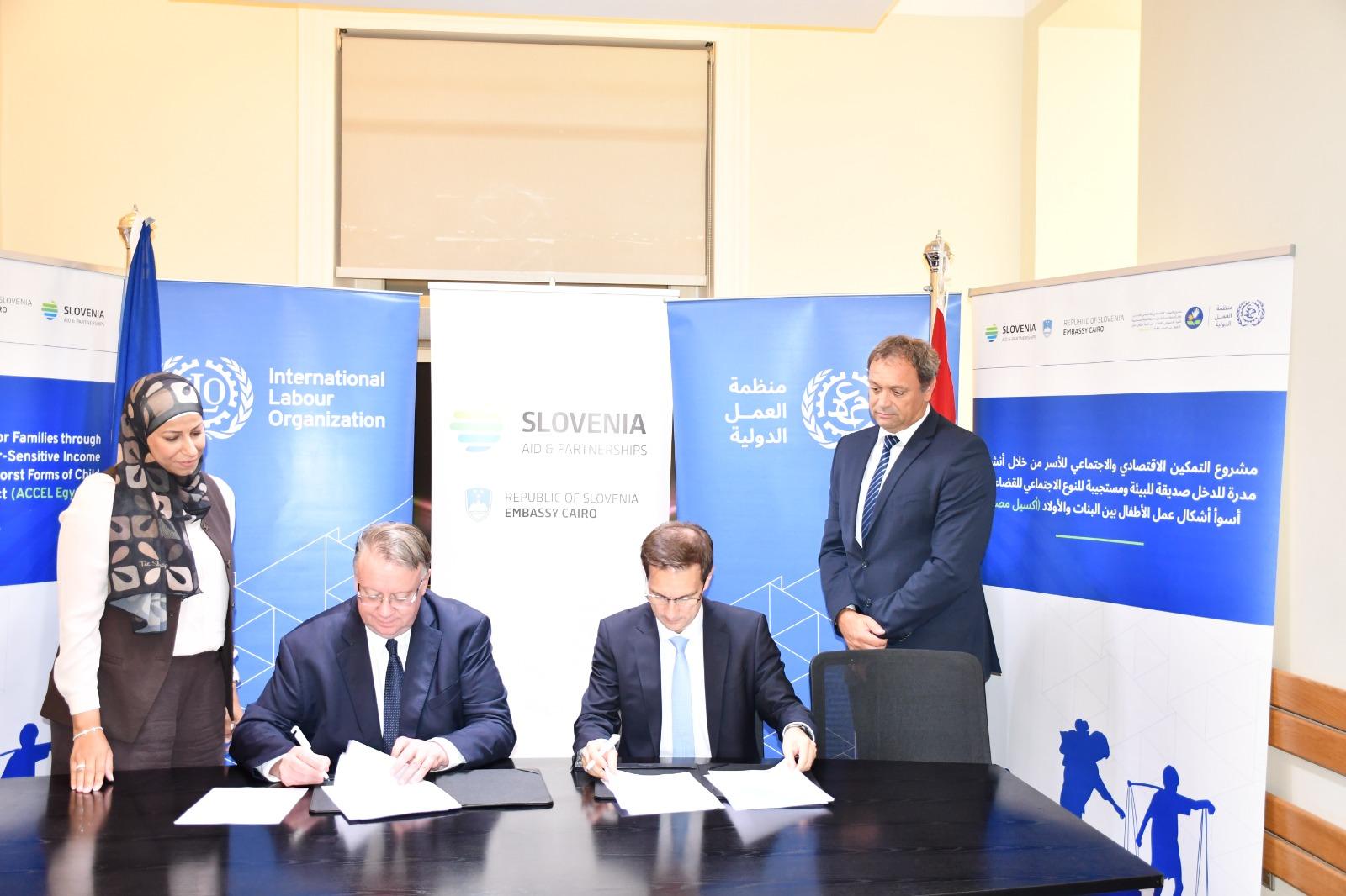 أقيمت مراسم التوقيع في مقر منظمة العمل الدولية بالقاهرة، واستضافها السيد/ إيريك أوشلان، مدير مكتب منظمة العمل الدولية في القاهرة، وسعادة السفير/ ساشو بودليسنك، سفير سلوڤينيا في مصر.
