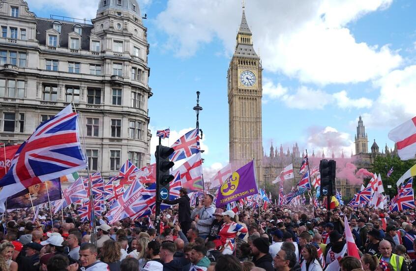 وتجمع المتظاهرون في ميدان راسل بلندن أمس السبت قبل أن يتوجهوا إلى الحي الحكومي في وايتهول. وحمل كثيرون منهم علم إنجلترا بعلامة الصليب الأحمر للقديس جورج إلى جانب علم المملكة المتحدة.