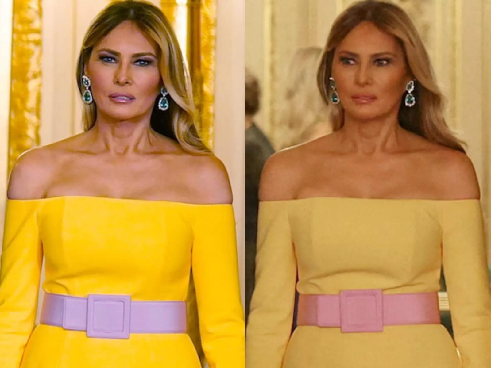 وخلال مأدبة عشاء أقامتها العائلة المالكة في قلعة وندسور مساء أمس الأربعاء، ظهرت ميلانيا بفستان من تصميم كارولينا هيريرا بدا بألوان متباينة في الصور المنتشرة عبر الإنترنت، بحسب ماعت جروب، ففي بعض اللقطات ظهر الفستان أصفر لامعًا بحزام بنفسجي، بينما بدا في صور أخرى أصفر كريميًا بحزام وردي فاتح.