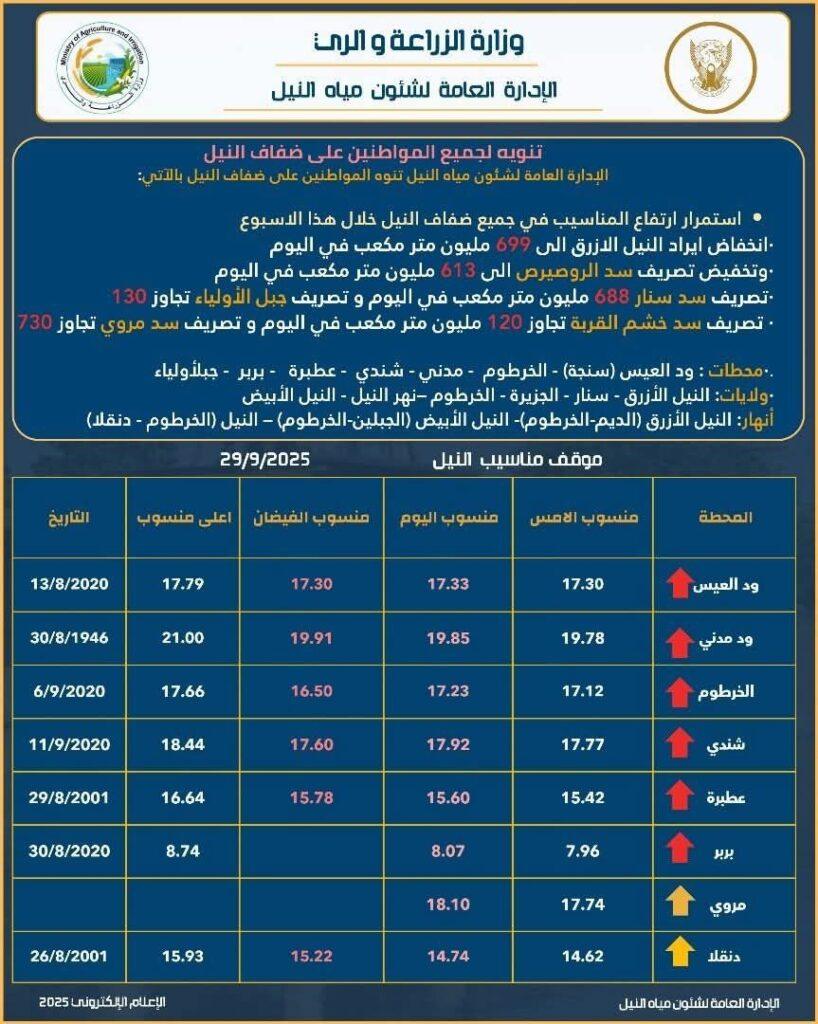وأكدت الوزارة، في منشورعلى صفحتها بموقع “فيسبوك”، استمرار ارتفاع المناسيب في جميع ضفاف النيل خلال هذا الأسبوع، مشيرة إلى انخفاض إيراد النيل الأزرق إلى 699 مليون متر مكعب في اليوم، وتخفيض تصريف سد الروصيرص إلى 613.