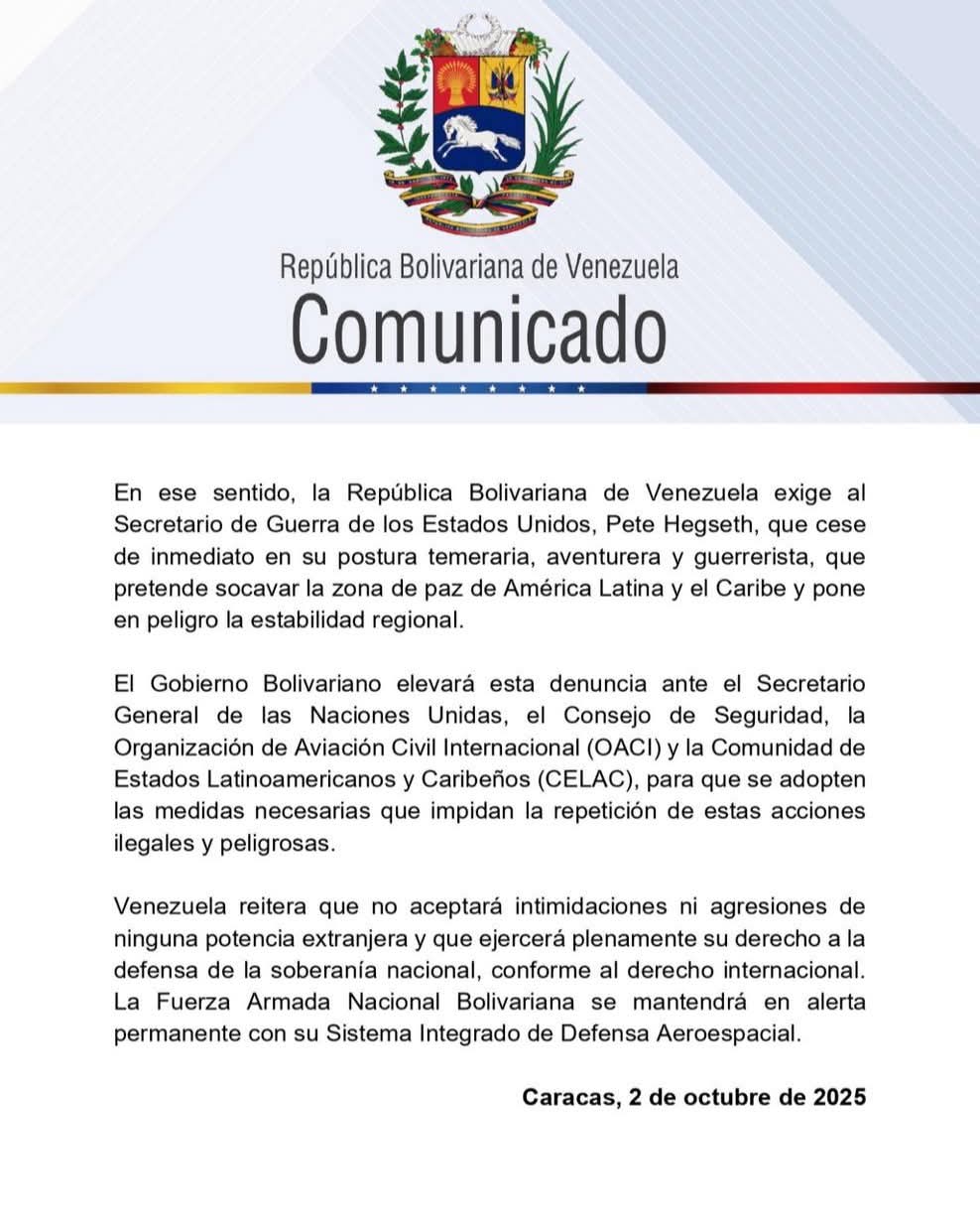 أدانت وزارتا الدفاع والشؤون الخارجية في جمهورية فنزويلا البوليفارية ورفضت بشدة الاقتحام غير القانوني لطائرات مقاتلة تابعة للولايات المتحدة الأمريكية تم رصدها في 2 أكتوبر 2025 على بعد حوالي 75 كيلومترًا من سواحلنا، داخل منطقة المعلومات الجوية (FIR) في مايكيتيا. وتشكل هذه المناورة، التي حددها قيادة الدفاع الجوي الشامل (CODAI)، استفزازًا يهدد السيادة الوطنية ويتعارض مع قواعد القانون الدولي واتفاقية شيكاغو للطيران المدني الدولي.