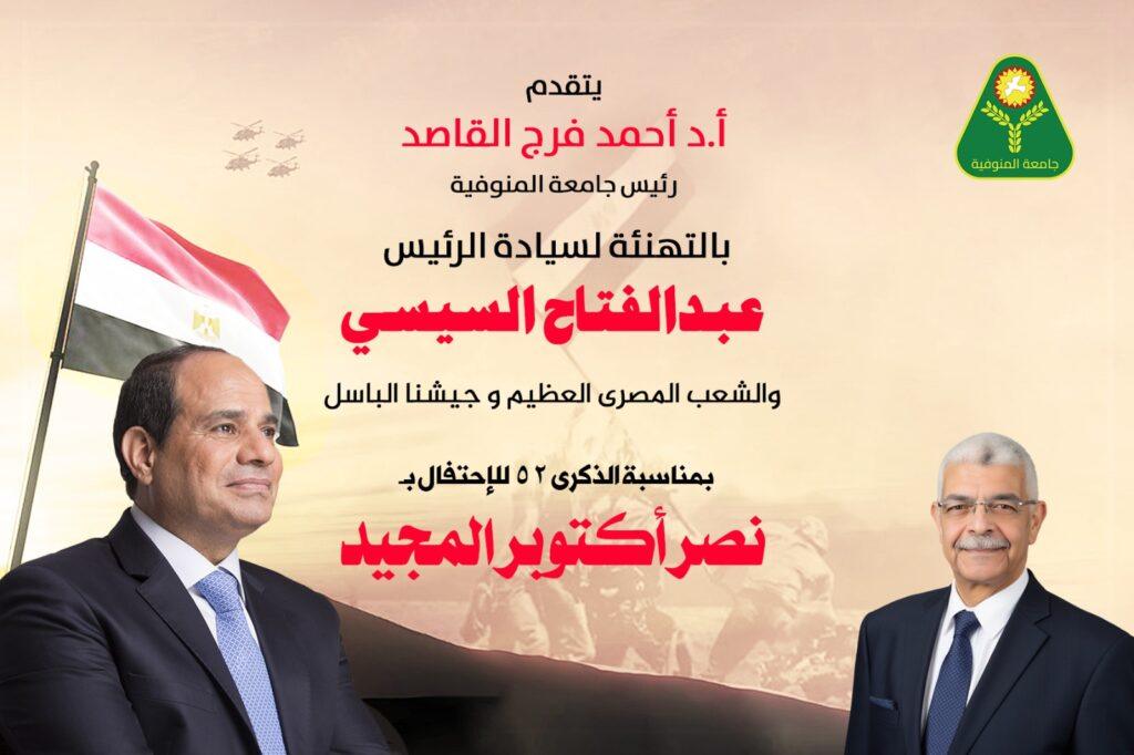 رئيس جامعة المنوفية يهنىء الرئيس السيسي القائد الأعلى للقوات المسلحة ورجال القوات المسلحة البواسل بذكري إنتصار أكتوبر المجيد
