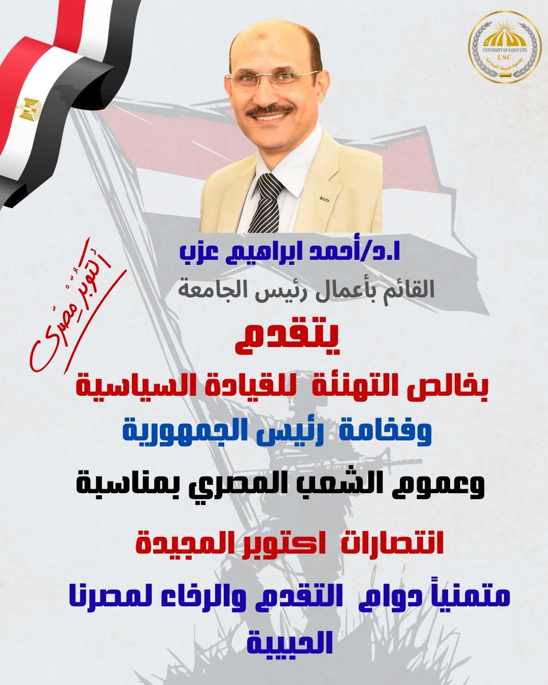 رئيس جامعة مدينة السادات يهنئ القيادة السياسية ورجال القوات المسلحة والشعب المصري بذكرى نصر السادس من أكتوبر المجيد