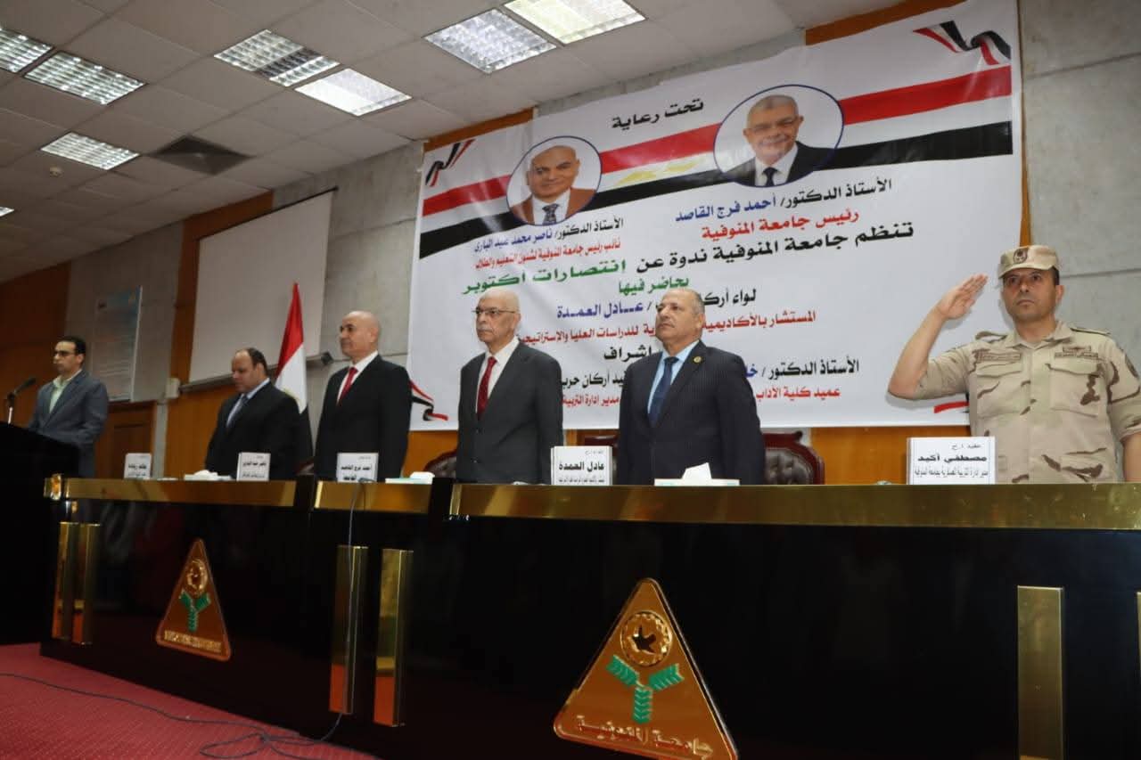 كما أكد ” القاصد” علي أن جامعة المنوفية تولي اهتمامًا كبيرًا بتوعية أبنائها الطلاب بتاريخ وطنهم المجيد، وتحرص على تنظيم مثل هذه الندوات التي تعزز قيم الانتماء الوطني وتعمق فهمهم لدور الجيش المصري في حماية مقدرات الوطن وصون أمنه القومي.”