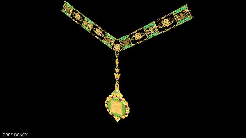 وتتوسط القلادة حلية دائرية تمثل رمز النيل الموحد بين الشمال والجنوب، حيث يرمز البردي للشمال واللوتس للجنوب، في دلالة على وحدة مصر منذ آلاف السنين.