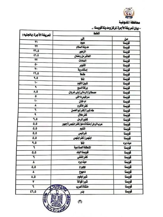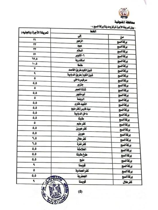 أصدر اليوم اللواء إبراهيم أبو ليمون محافظ المنوفية قرارا بشأن تعديل التعريفة الجديدة والمقررة لركوب سيارات الأجرة والسرفيس والتاكسي والتوك توك بدائرة المحافظة، وذلك عقب قرار لجنة التسعير التلقائي للمنتجات البترولية وزيادة أسعار البنزين والسولار اعتبارا من اليوم الجمعة الموافق 16 أكتوبر 2025.