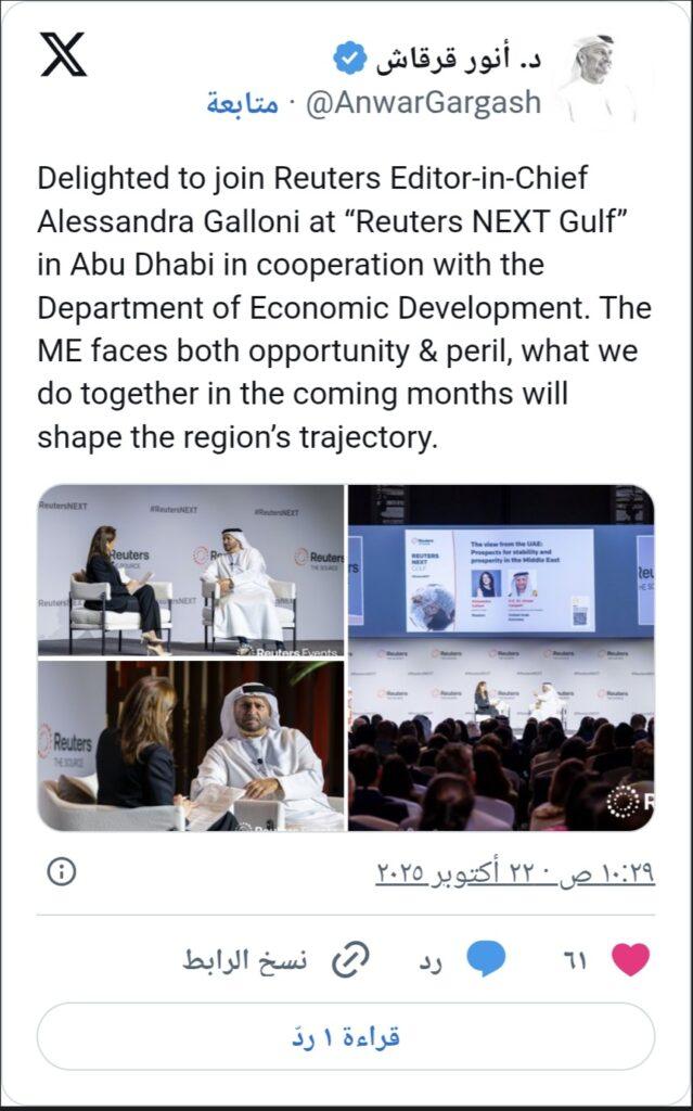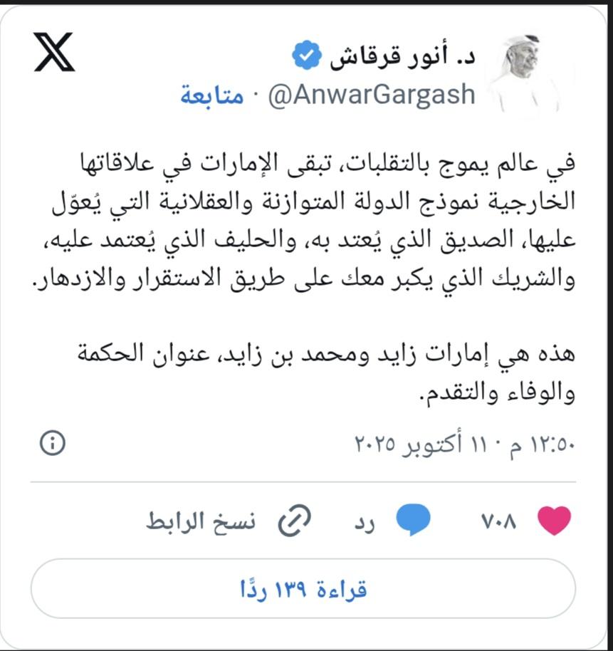 وكتب قرقاش على حسابه الرسمي في منصة “إكس”: في عالم يموج بالتقلبات، تبقى الإمارات في علاقاتها الخارجية نموذج الدولة المتوازنة والعقلانية التي يعول عليها، الصديق الذي يعتد به، والحليف الذي يعتمد عليه، والشريك الذي يكبر معك على طريق الاستقرار والازدهار”.