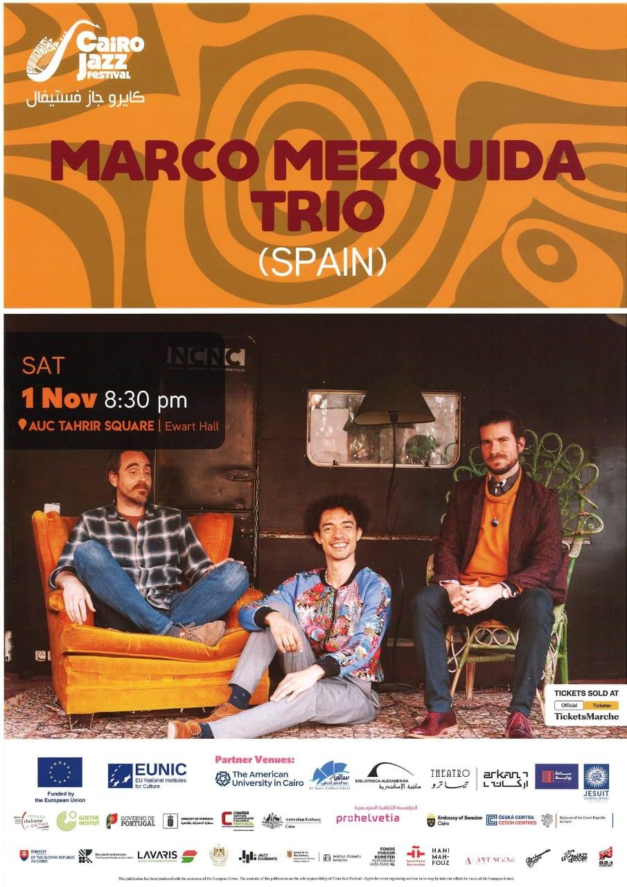 في إطار التعاون الثقافي بين معهد ثربانتس بالقاهرة وشبكة المعاهد الثقافية الوطنية للاتحاد الأوروبي (EUNIC–Egypt)، وبالشراكة مع وفد الاتحاد الأوروبي في مصر، يستضيف مهرجان القاهرة الدولي للجاز فرقة الموسيقي الإسباني ماركو ميزكيدا الثلاثية في أمسية موسيقية استثنائية تُقام يوم السبت 1 نوفمبر في قاعة إيوارت بالجامعة الأمريكية بالقاهرة.
