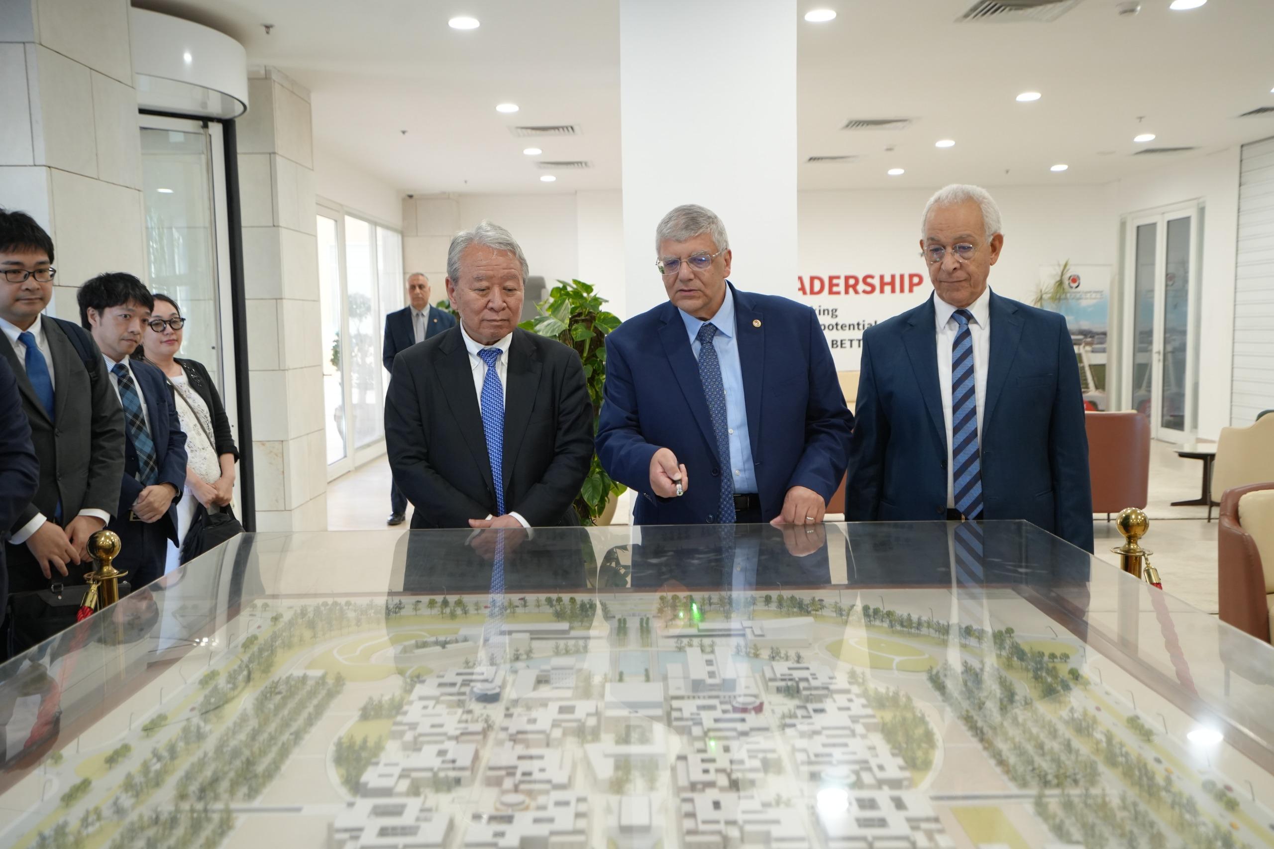 استقبل الدكتور هاني هلال رئيس مجلس أمناء الجامعة المصرية اليابانية للعلوم والتكنولوجيا، والدكتور عمرو عدلي رئيس الجامعة، أمس بمقر الجامعة في برج العرب، البروفيسور أكيهيكو تاناكا رئيس هيئة التعاون الدولي اليابانية (JICA)، ووفد مرافق له رفيع المستوى من هيئة الجايكا بطوكيو ومن مكتب الجايكا بالقاهرة.