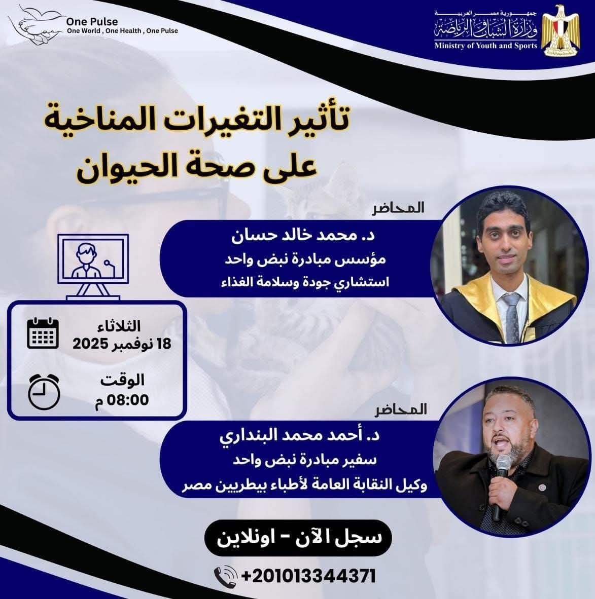 وتأتي هذه الندوة ضمن سلسلة فعاليات متواصلة يقودها د. محمد خالد حسان تحت مظلة مبادرة “نبض واحد – One Pulse”، التي أصبحت منصة شبابية فاعلة تعزز الوعي البيئي والصحي، وتواكب توجه الدولة في دعم المعرفة بقضايا المناخ، جودة الغذاء، والصحة العامة والبيطرية.