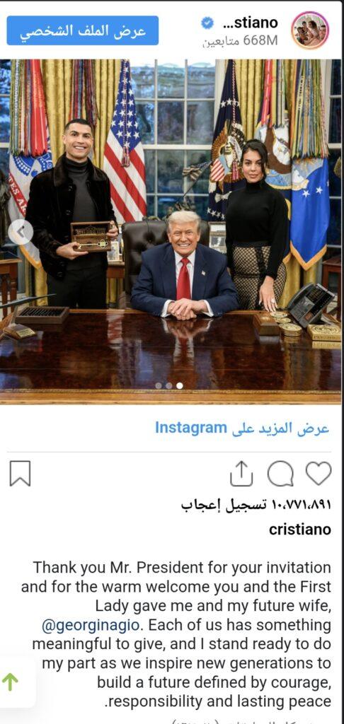 ونشر رونالدو عبر حساباته على منصات التواصل الاجتماعي عدة صوره له ولشريكته جورجينا مع دونالد ترامب في البيت الأبيض.