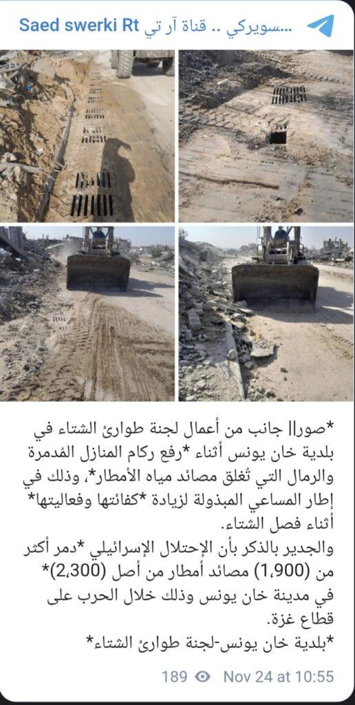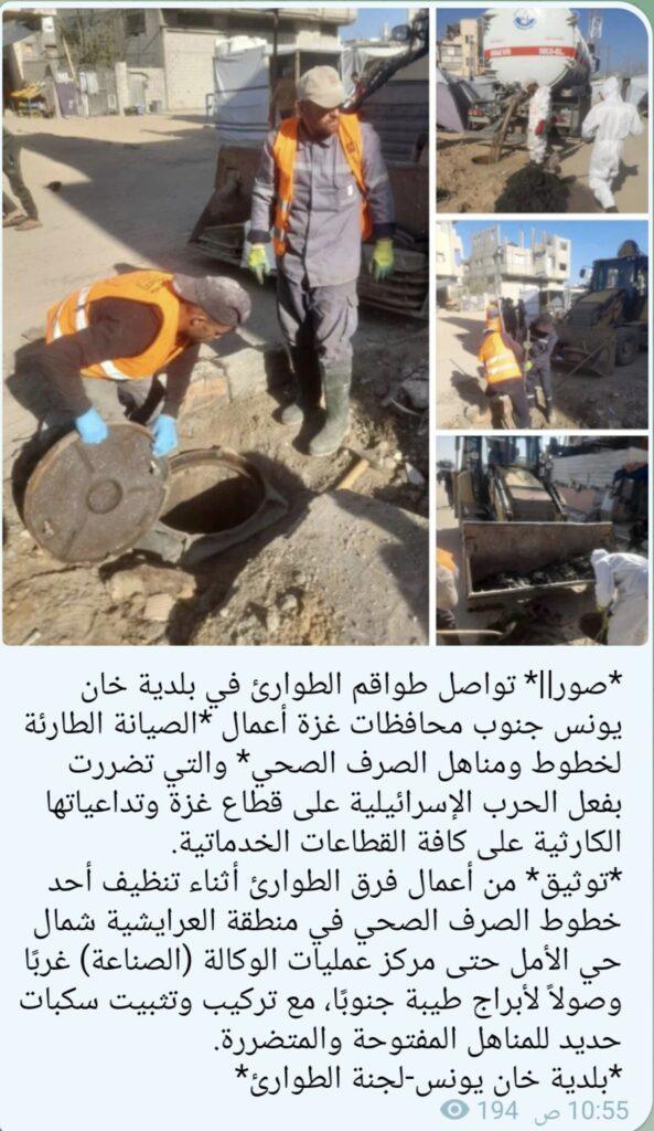 ميدانيا، تواصلت أعمال لجان الطوارئ في بلدية خان يونس لرفع الركام وصيانة خطوط ومناهل الصرف الصحي المتضررة بفعل الحرب، في جهود تهدف إلى تعزيز كفاءة البنية التحتية قبل موسم الأمطار، مع الإشارة إلى تدمير أكثر من 1900 مصيدة أمطار من أصل 2300 خلال المعارك الأخيرة.