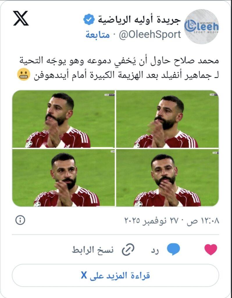 شهد نجم ليفربول والمنتخب المصري محمد صلاح لحظة صعبة بعد خسارة فريقه أمام آيندهوفن الهولندي بنتيجة 1-4، ضمن منافسات الجولة الخامسة من دور المجموعات بدوري أبطال أوروبا 2025-2026.