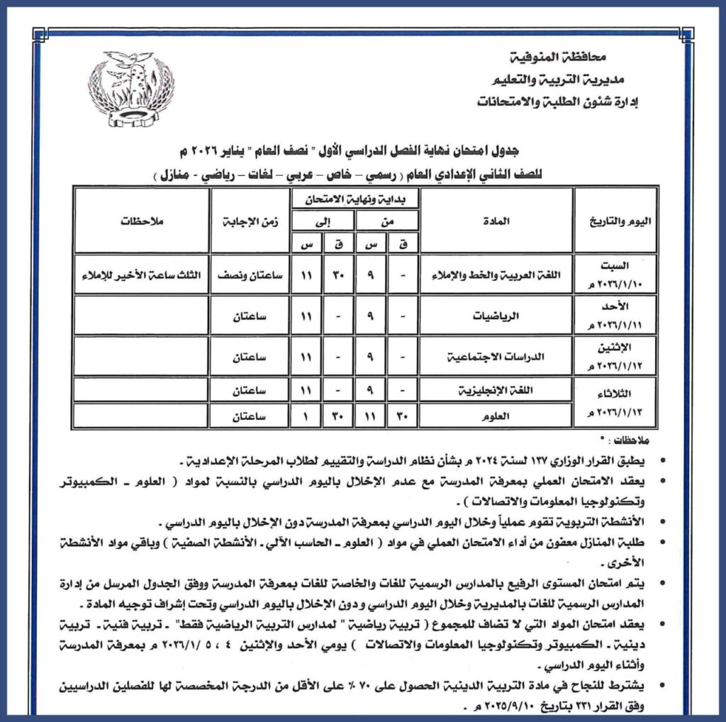 محافظ المنوفية يعتمد جداول امتحانات الفصل الدراسي الأول 2026