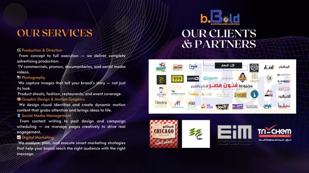 منذ تأسيسها، اعتمدت B.bold على تقديم حلول إعلامية وتسويقية قائمة على فهم هوية كل عميل وبناء صورة ذهنية متماسكة للعلامة التجارية، من خلال محتوى بصري قابل للتنفيذ والقياس، وتعمل الشركة مع شركات ومؤسسات في السوق المحلي، إضافة إلى علامات تجارية ناشئة وكبرى