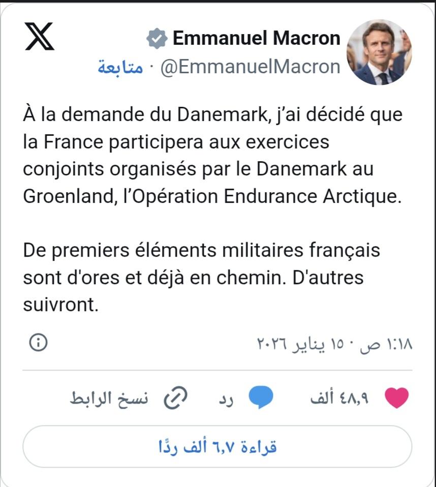 وأضاف ماكرون أن فرنسا ستشارك في “تدريبات مشتركة” تنظمها الدنمارك تحت اسم “عملية الصمود القطبي”، وأكدت السويد والنرويج مشاركتهما أيضا.
