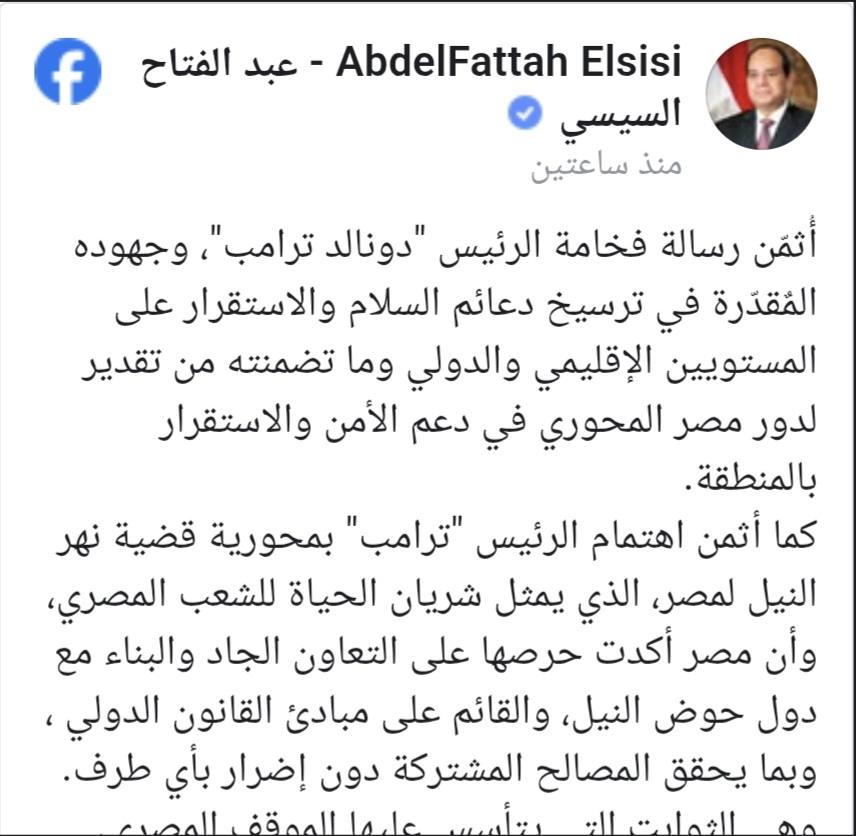 وكتب السيسي في منشور على فيسبوك: “أُثمّن رسالة الرئيس دونالد ترامب، وجهوده المٌقدرة في ترسيخ دعائم السلام والاستقرار على المستويين الإقليمي والدولي وما تضمنته من تقدير لدور مصر المحوري في دعم الأمن والاستقرار بالمنطقة”.