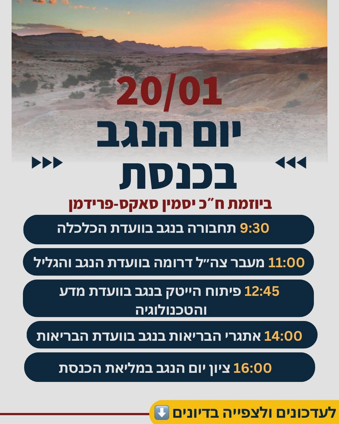 من المقرر أن يُحتفل يوم الثلاثاء المقبل، 20 يناير، بـ”يوم النقب” داخل الكنيست الإسرائيلي، في مبادرة لعضوة الكنيست ياسمين ساكس-فريدمان من حزب יש עתיד (هناك مستقبل)، الذي يضع صحراء النقب ومشاكلها على رأس جدول الأعمال السياسي.