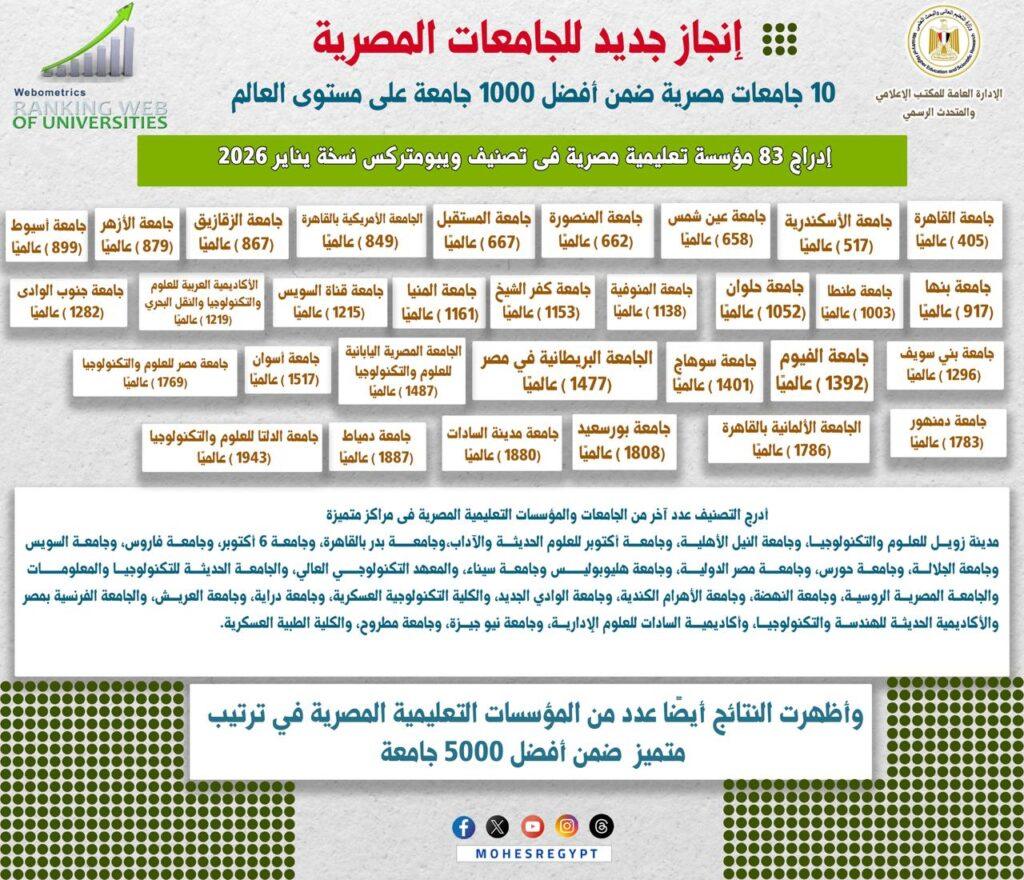أعلن تصنيف ويبومتركس العالمي (Webometrics Ranking of World Universities)، نتائج نسخة يناير لعام 2026 والتي أظهرت إدراج 83 مؤسسة تعليمية مصرية، لتحافظ على زيادة متواصلة بنتائج التصنيف حيث تم إدراج 76 مؤسسة في عام 2022، ثم 78 مؤسسة في عام 2023، ثم 79 مؤسسة في 2024، ثم 81 مؤسسة في نسخة يوليو 2024.