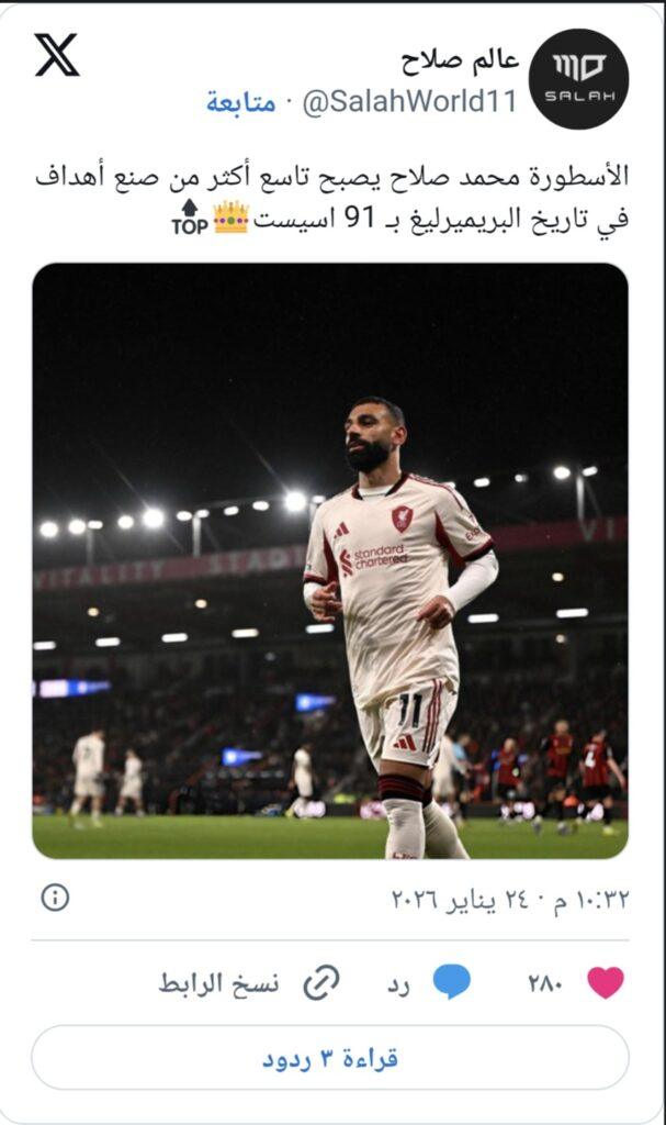 حقق نجم فريق ليفربول محمد صلاح رقما جيدا رغم الخسارة القاتلة ضد بورنموث مساء السبت في إطار منافسات الجولة 23 من بطولة الدوري الإنجليزي الممتاز.