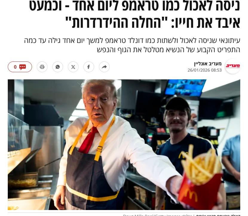 عادت عادات الأكل لدى رئيس الولايات المتحدة دونالد ترامب مؤخرًا إلى العناوين، بعد أن قال وزير الصحة الأميركي روبرت إف. كينيدي جونيور إن «بقاؤه على قيد الحياة هو معجزة». فترامب، كما هو معروف، من عشّاق الوجبات السريعة، وخصوصًا ماكدونالدز، ويلتزم بنظام غذائي يومي يثير الكثير من علامات الاستفهام لدى خبراء الصحة. صحفي بريطاني قرر اختبار ما يحدث عند اتباع «الحمية الرئاسية» ليوم واحد فقط.