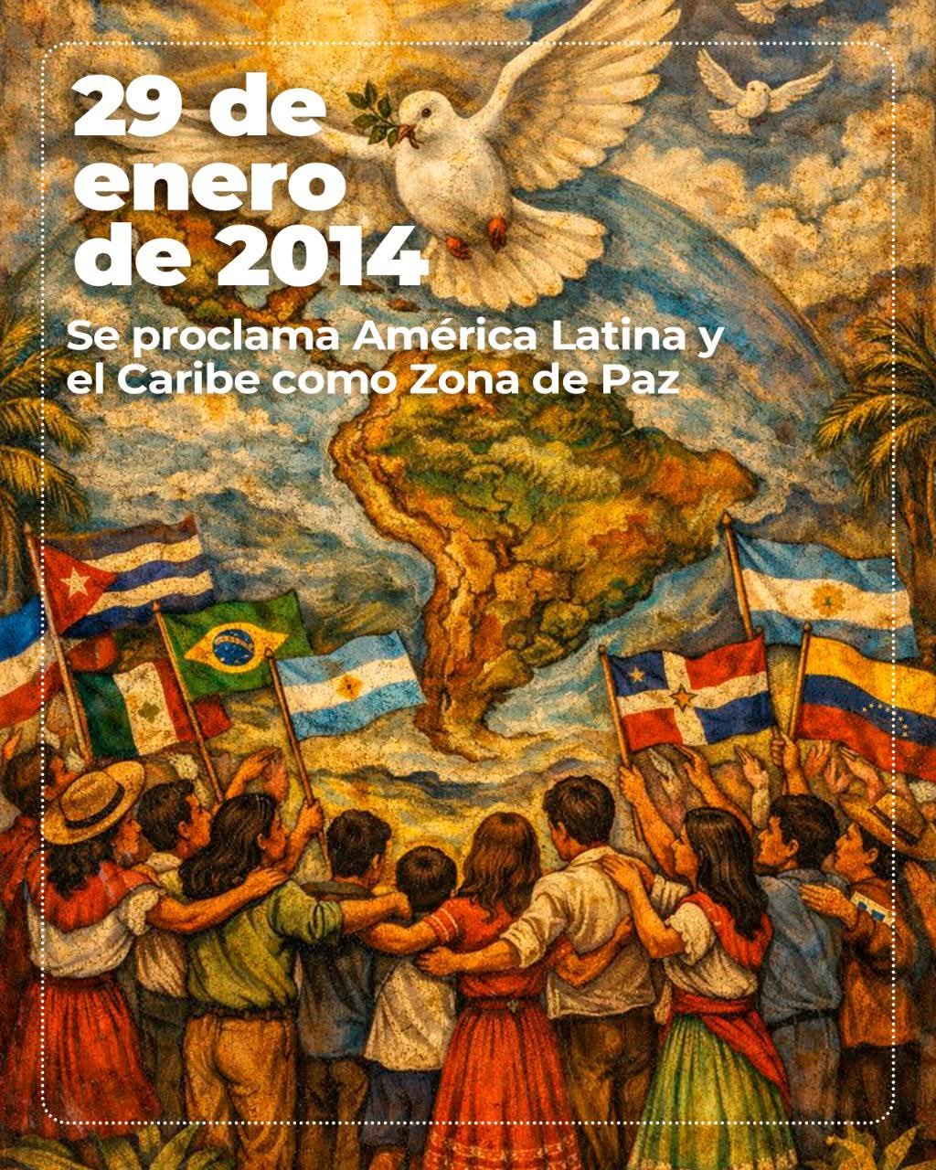 تحتفل فنزويلا بالذكرى السنوية الثانية عشرة لإعلان أمريكا اللاتينية ومنطقة البحر الكاريبي منطقة سلام من قبل الجماعة الاقتصادية لدول أمريكا اللاتينية ومنطقة البحر الكاريبي (CELAC)، وهو معلم أساسي في سعينا الجماعي لتحقيق السلام والاستقرار والتعاون والاحترام المتبادل بين بلدان المنطقة. لا يؤكد هذا الإعلان التزام الدول الأعضاء بالحل السلمي للنزاعات ورفض التدخل الأجنبي فحسب، بل إنه يعزز أيضًا التكامل الإقليمي.