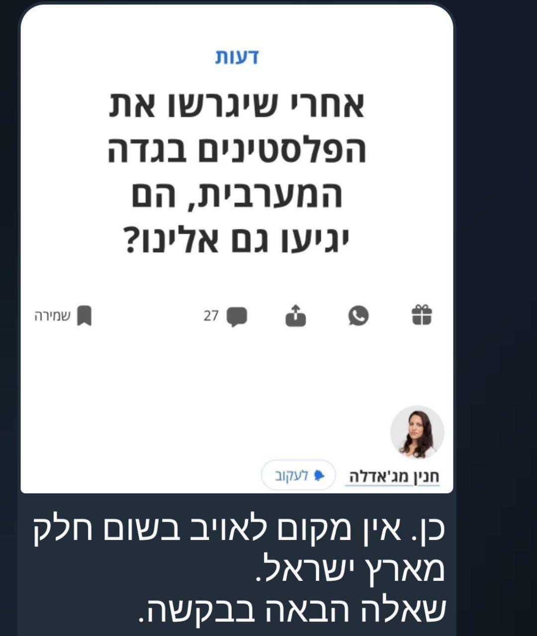 علّق إليشاع يراد، أحد قادة مجموعة «فتيان التلال» الاستيطانية المتطرفة، على مقال نشرته صحيفة «هآرتس» تساءل فيه عن احتمال أن يكون التهجير التالي بعد الضفة الغربية موجّهًا لفلسطينيي الداخل المحتل عام 1948، بالقول: «نعم… لا مكان لأعداء إسرائيل… لننتقل للسؤال التالي».