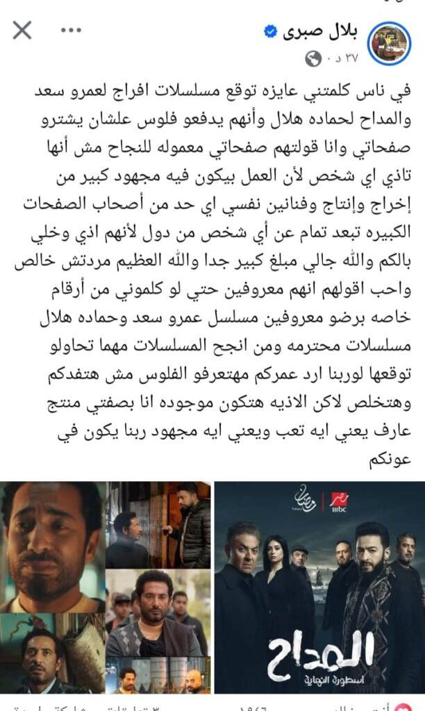 بلال صبري يرفض الإساءة إلى مسلسلي عمرو سعد وحمادة هلال ويؤكد: لن أكون طرفًا في تشويه أي نجاح درامي
