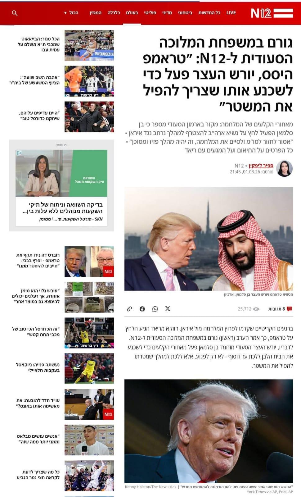 في تطور لافت ومثير للجدل، نقلت القناة العبرية القناة 12 عن مصدر وصفته بأنه من العائلة المالكة السعودية، تصريحات تفيد بأن ولي العهد السعودي الأمير محمد بن سلمان لعب دورًا حاسمًا في إقناع الرئيس الأمريكي دونالد ترامب بالمضي قدمًا في توجيه ضربة واسعة ضد إيران، رغم تردد الأخير في البداية.