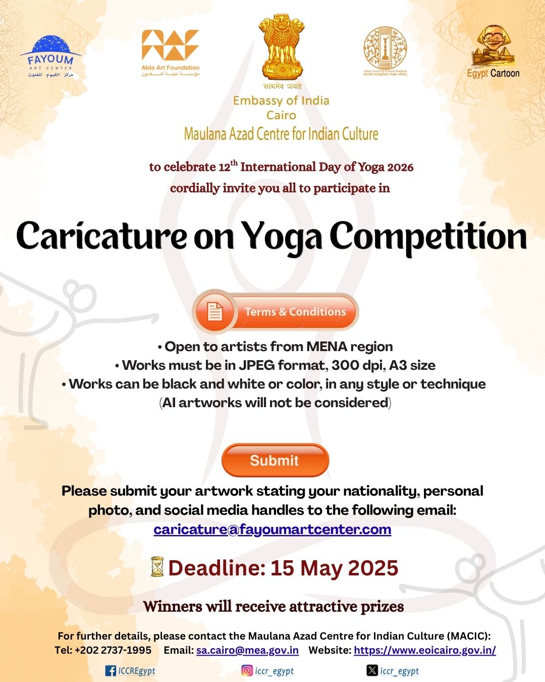 تُسعد سفارة الهند في القاهرة، بالتعاون مع مؤسسة عبلة للفنون، ومركز الفيوم للفنون، ومدونة مصر للكاريكاتير، أن تعلن عن مبادرة فنية مميزة، وهي مسابقة “الكاريكاتير عن اليوجا”، وذلك احتفالًا باليوم العالمي الثاني عشر لليوجا لعام 2026. وتدعو هذه المسابقة الفريدة فناني الكاريكاتير إلى التعبير الإبداعي عن روح اليوجا وممارستها وفلسفتها من خلال فن الكاريكاتير.