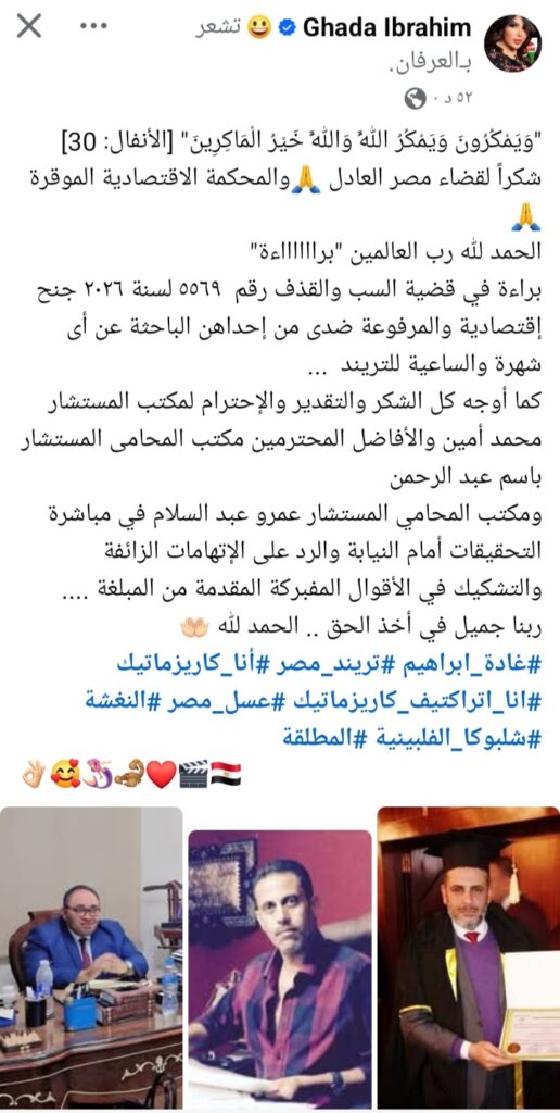 وفي أول تعليق لها بعد صدور الحكم، نشرت غادة إبراهيم عبر حسابها الشخصي على موقع التواصل الاجتماعي “فيسبوك” رسالة قوية، استهلتها بآية قرآنية:“وَيَمْكُرُونَ وَيَمْكُرُ اللَّهُ وَاللَّهُ خَيْرُ الْمَاكِرِينَ”، معبرة عن امتنانها لقضاء مصر وثقتها في العدالة.