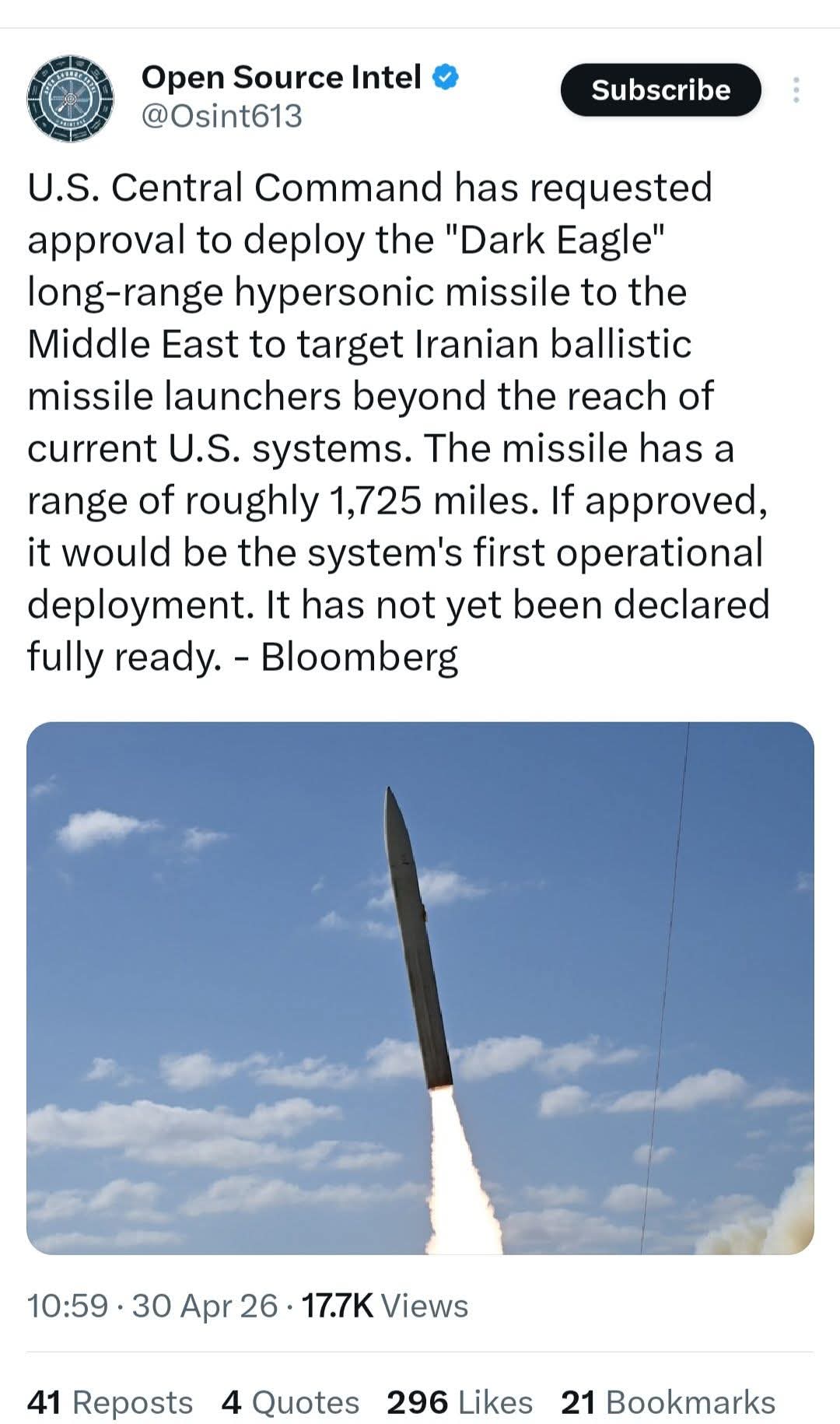 في مؤشر خطير على أن المواجهة الأمريكية الإيرانية تتجه إلى مرحلة أكثر شراسة وتعقيدًا، كشفت وكالة بلومبيرغ أن القيادة المركزية الأمريكية تقدمت بطلب رسمي للموافقة على نشر صاروخ دارك إيجل فرط الصوتي طويل المدى في منطقة الشرق الأوسط، بهدف استخدامه في استهداف منصات إطلاق الصواريخ الباليستية الإيرانية الموجودة في عمق الأراضي الإيرانية، والتي باتت خارج نطاق التغطية الفعالة للأنظمة الصاروخية الأمريكية الحالية.